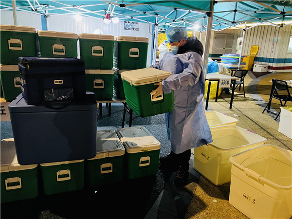 姑苏区市场监管局党员周松、傅之尧、施志龙、朱吉坤4名同志分别从疾控中心出发,将今天最后一批核酸检测样本运送到姑苏气膜实验室(方舱)进行检测。仅今日,他们四人分别运送了17趟,累计515320剂次的核酸检测样本。交接完成,已经是深夜十点多。
